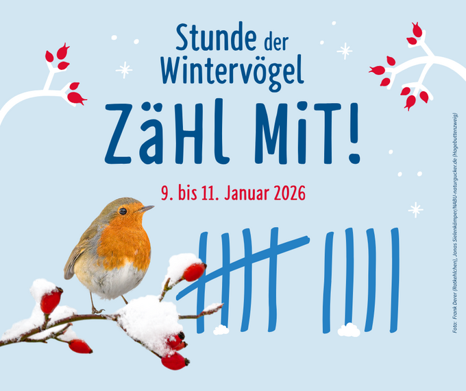 Die „Stunde der Wintervögel“ ist die größte bürgerwissenschaftliche Mitmachaktion Deutschlands, bei der möglichst viele Menschen gemeinsam große Datenmengen sammeln. Mitmachen können alle, ob ganz neu im Birding oder schon fortgeschritten. Die Zählung liefert wichtige Hinweise zur Entwicklung der heimischen Vogelwelt. Damit die Vögel treffsicher erkannt werden, stellt der NABU zahlreiche Informationen im Internet bereit. Die Zählhilfe des NABU können sie runterladen, sie erleichtert Ihnen die Erfassung der Wintervögel. Die Ergebnisse der Zählung können Sie bis zum 19. Januar online melden unter www.NABU.de/onlinemeldung oder über die Kostenlose NABU-App Vogelwelt.