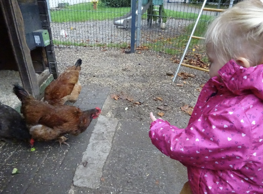 Innerhalb kurzer Zeit ist das Gehege der Tiere zu einem beliebten Treffpunkt für Kinder und Eltern am Morgen und in der Abholzeit geworden. Gruppenübergreifend übernehmen die Kinder gemeinsam mit den Mitarbeiter*innen die Versorgung der Tiere. Dazu gehört die Versorgung mit Wasser und Futter, das Säubern der Ställe und des Geheges und natürlich auch das Einsammeln von gelegten Eiern aus den Nestern. Wichtig auch der Kontakt zu den Hühnern durch Streicheln und Füttern aus der Hand. Am Wochenende und während der Schließtage übernehmen Eltern die Versorgung und Pflege, was bisher hervorragend klappte.